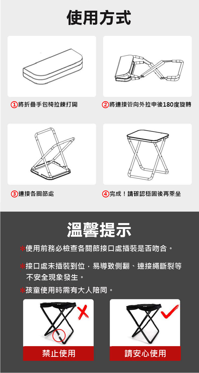 2.請依照展開方式使用,並確認椅座穩固方可坐下。